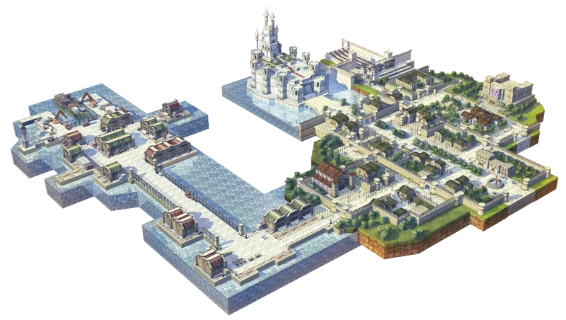 The city is divided into four blocks: North Block, East Block, West Block, and South Block. Entering from Grancel through its main gate in the south from the Royal Avenue leads to its main street, which stretches until the entrance of the Grancel Castle, the prestigious symbol of the city and seat of Liberl's monarchy.