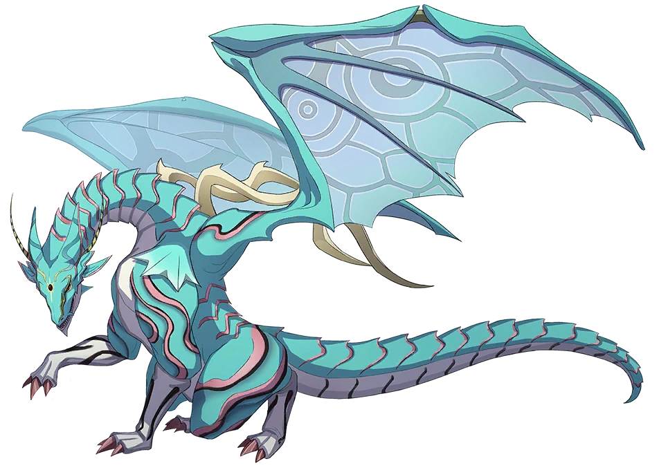 Ragnard is a colossal quadrupedal dragon of white and teal color. He has several pink markings all over his body, acting as a trim for the scales and plates on his back and two golden arches with protrude from just above his massive wings. Ragnard has two main horns surrounding his head, which has several more spiked points. He also has gleaming red eyes and a gem on his forehead, where a replica Gospel is capable of slotting.