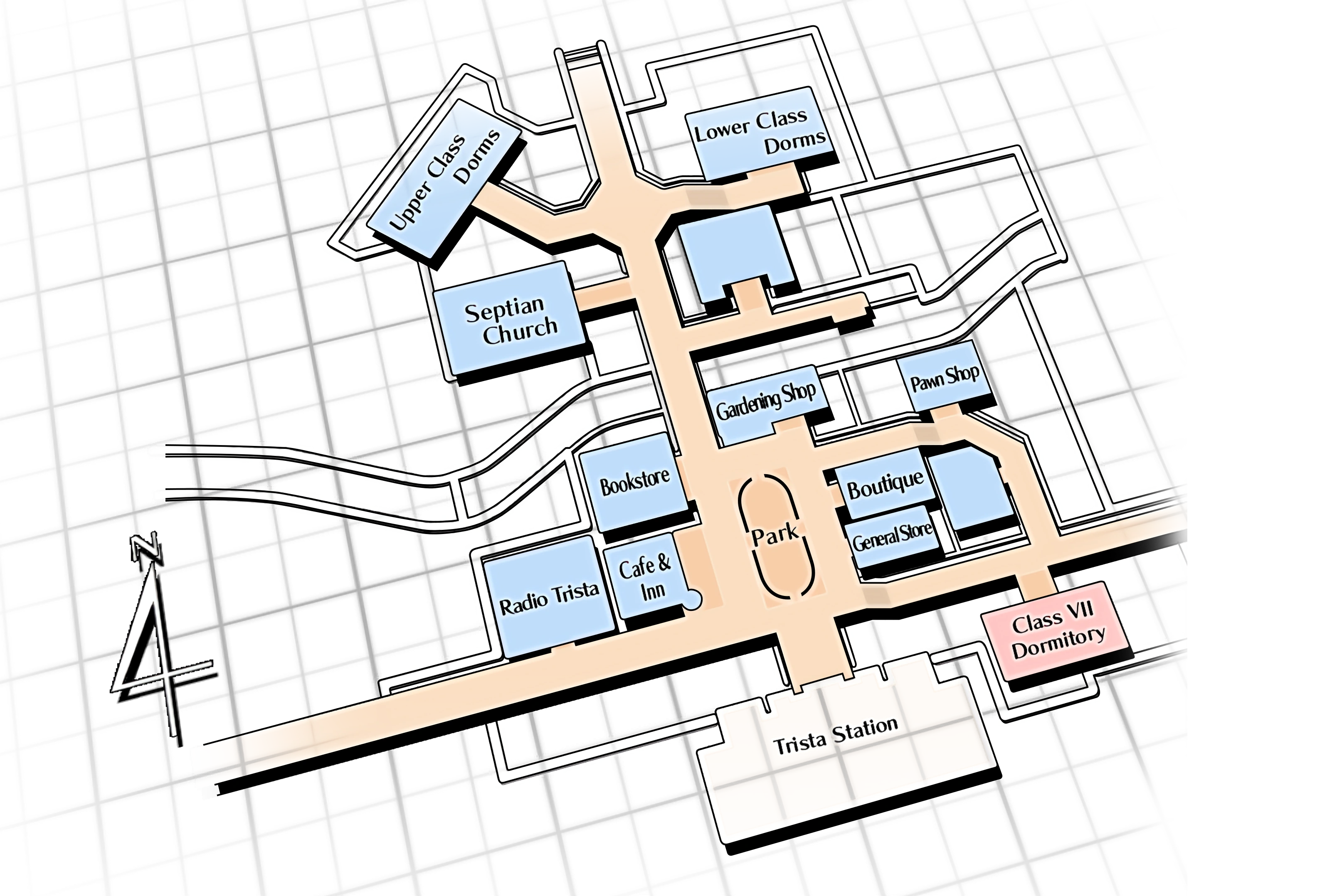 Reachable via a 20-minute ride on the transcontinental railroad from Heimdallr, Trista is a somewhat old-fashioned town that maintains a cozy atmosphere with several shops built around a central park. Trista is best known for Thors Military Academy located in the north side of the town, with the students and faculty filling the streets. Thors Military Academy was founded by Emperor Dreichels Reise Arnor after the War of the Lions. The Old Schoolhouse behind the academy is site of particular spiritual strength.